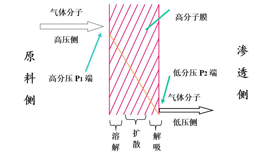 膜法氣體分離技術(shù)是利用氣體各組分在通過膜時的滲透速率的不同來分離的,其機理是氣體的溶解—擴散—解析過程,通常小分子或極性強的分子如H2、H2O、H2S、CO2等透過膜的滲透速率快,稱之為快氣,而相對較大或極性弱的分子如N2、CH4、Ar、CO滲透速率較慢,稱之為慢氣。