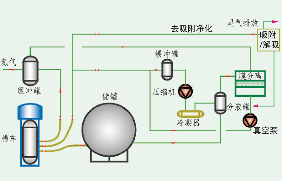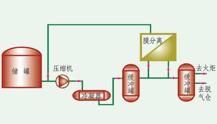 儲罐卸壓排放氣或汽車卸凈后的尾氣經緩沖罐后,進入壓縮/冷凝,然后通過氣液分離罐將液相產品分離出去。分液罐的不凝氣進入膜分離系統,滲透氣和真空解吸氣返回到壓縮機入口:膜分離系統的尾氣為提濃氮氣,非甲烷烴低于15q/㎡送至氮氣緩沖罐或進一步送吸附凈化<60mg/m,油氣總烴回收率大于97%。