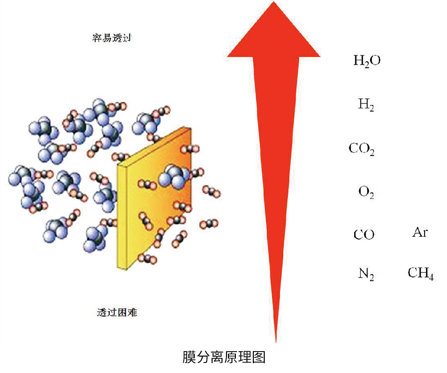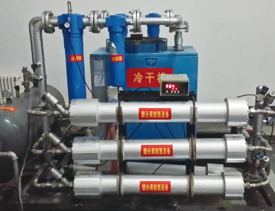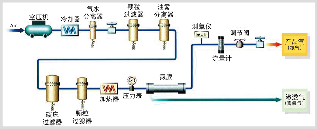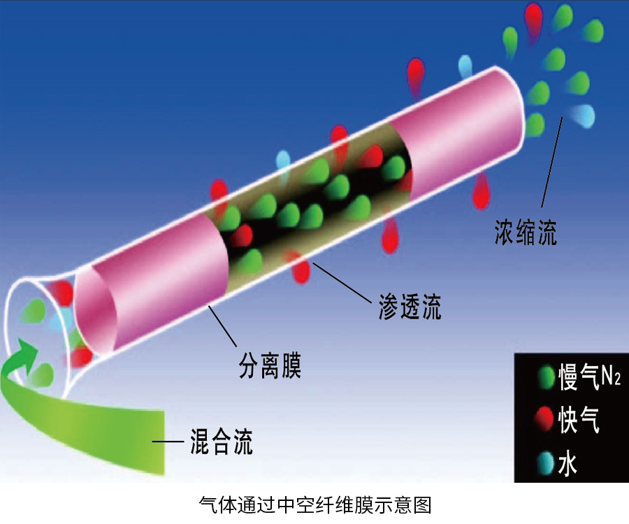 空氣中的氮氣和氧氣在膜兩側壓力差的作用下,由于它們在膜中的溶解度和擴散系數的不同,導致滲透速率較快的水蒸氣、氧氣等氣體優先透過膜,成為富氧氣體;而滲透速率較慢的氮氣在滯留側富集,成為干燥的富氮氣體。