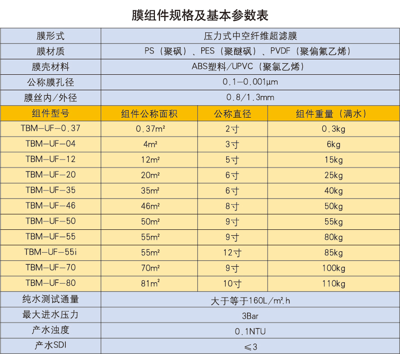 TBM超濾膜元件規格與型號